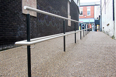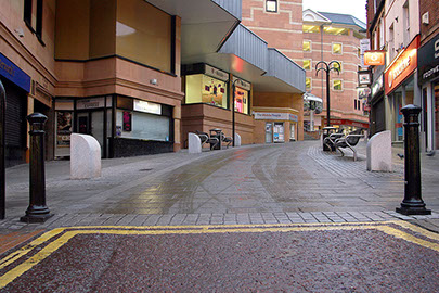 Repaving of the main shopping high street in Rochdale town centre. The work involved removing the existing tarmac road surface and laying natural stone flags, granite setts and conservation kerbs. Replacement of street furniture, drainage and installation of LED lighting.